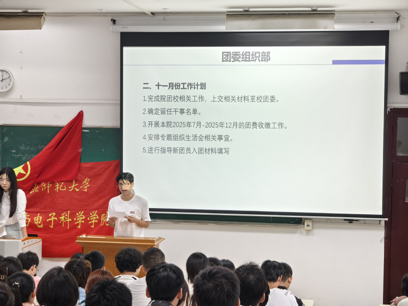 为统筹推进学院团学工作,明确学期任务重点,凝聚团学组织力量,10月16日中午,物理与电子科学学院于教育大楼1J12教室召开十月团委工作例会。院团委学生副书记陈卓君、梁羽婷,青大队主席熊欣、吴烨,新媒体中心主席张祖荣、余奕樊,全体团委学生干部、25级各班团支书及青小队长参会。会议由团委组织部副部长周馨媛主持。