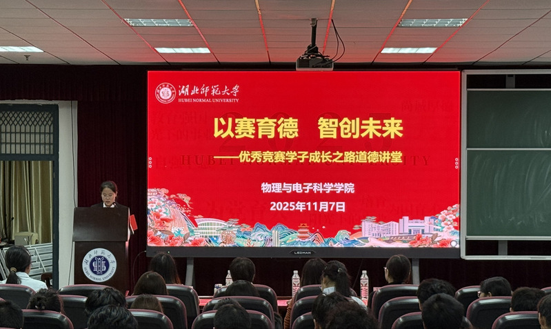 为厚植湖师学子的道德素养,筑牢思想道德根基,11月7日晚,物理与电子科学学院于信息大楼二楼报告厅举办2025年“以赛育德,智创未来”道德讲堂活动。湖北师范大学国资处副处长陈小露、陈晨,物理与电子科学学院党委副书记刘雅,辅导员李双翼及25级学生出席活动。本次活动由吴甜甜主持。