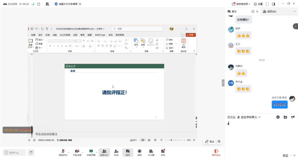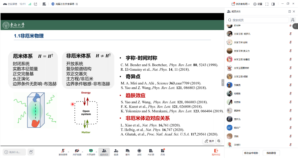 2025年11月20日星期四晚上19:00,物电学院邀请到了东南大学肖磊教授在线上做了题为“非厄米开放系统的动力学及其应用的研究”的学术报告。物电学院光学工程全体研究生和部分青年教师参加了这场精彩的学术报告,报告由单传家副院长主持。
