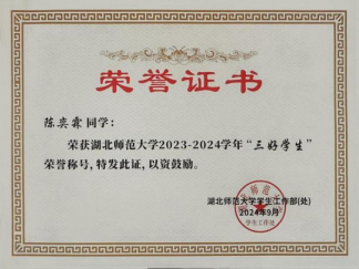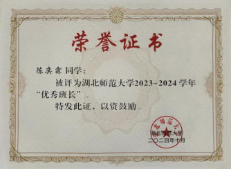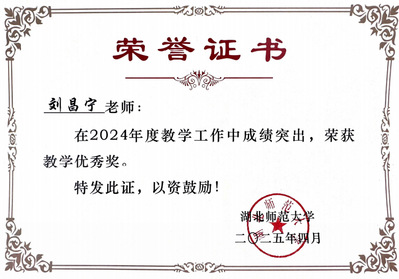 多次获评校级综合优秀、教学优秀、优秀班主任及优秀指导教师等荣誉,并两度荣获黄石市九三学社优秀社员称号。获湖北师范大学2024—2025学年“十佳班主任”荣誉称号。