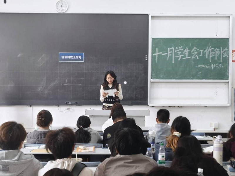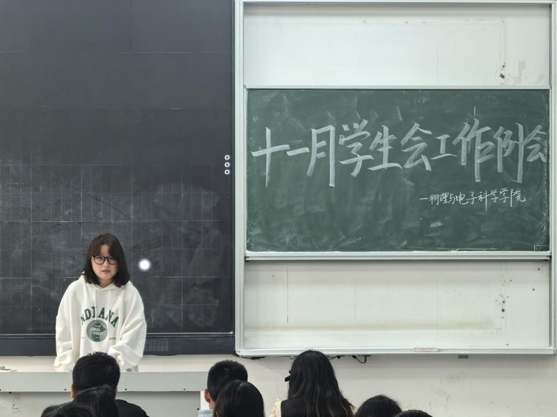 为进一步提高学生会工作效率和组织能力,实现持续发展,11月3日中午,物理与电子科学学院学生会于科技大楼9101教室召开十一月工作例会。学生会主席刘河出幸、副主席谢馨悦以及各部门学生干部出席。会议由秘书部部长张振宇主持。