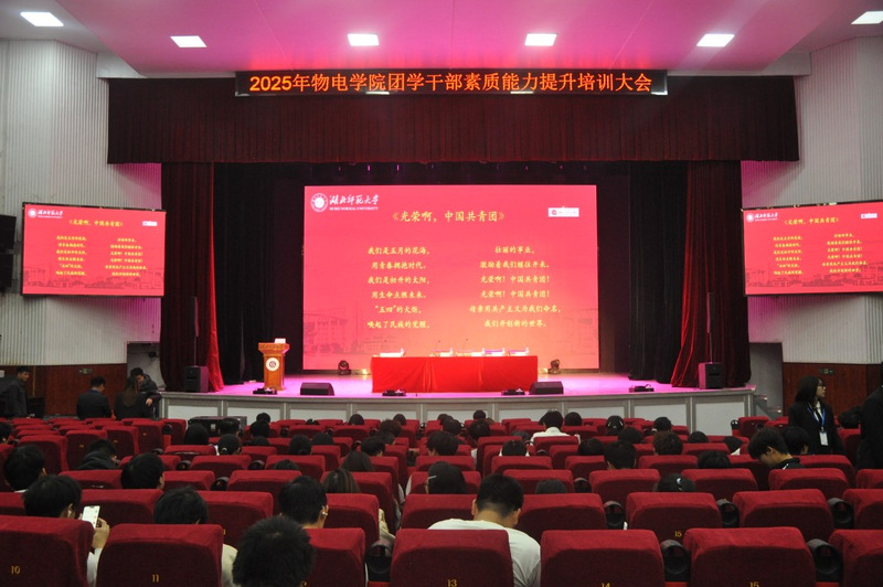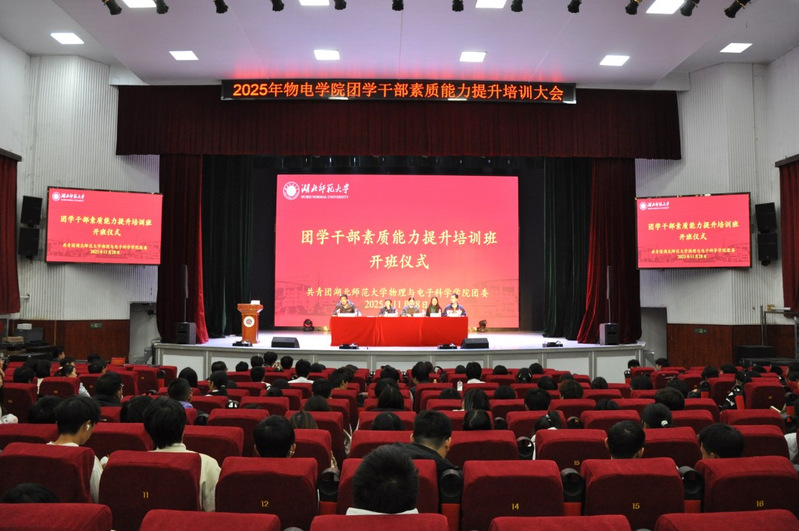 11月28日晚,物理与电子科学学院于湖师大礼堂举行团学干部素质能力提升培训班开班仪式。参与本次开班仪式的有学院党委书记孙丹娟、党委副书记刘雅、学工办仇奥老师、李可老师,学院全体团学干部及24、25级班干部代表。仪式由学院团委副书记田学泽主持。