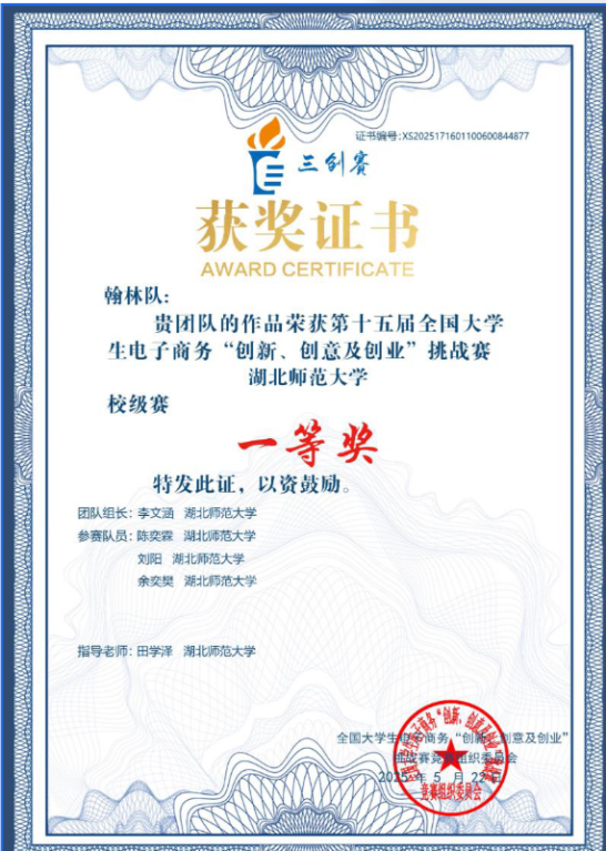 11、2025年5月,第15届全国大学生电子商务“创新,创意及创业”挑战赛 湖北师范大学校级赛;一等奖