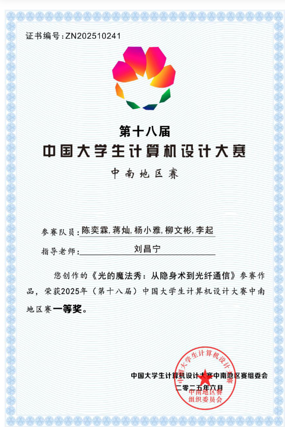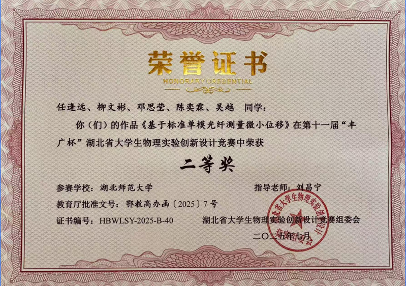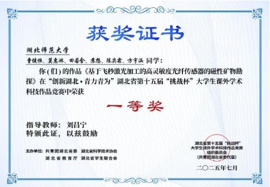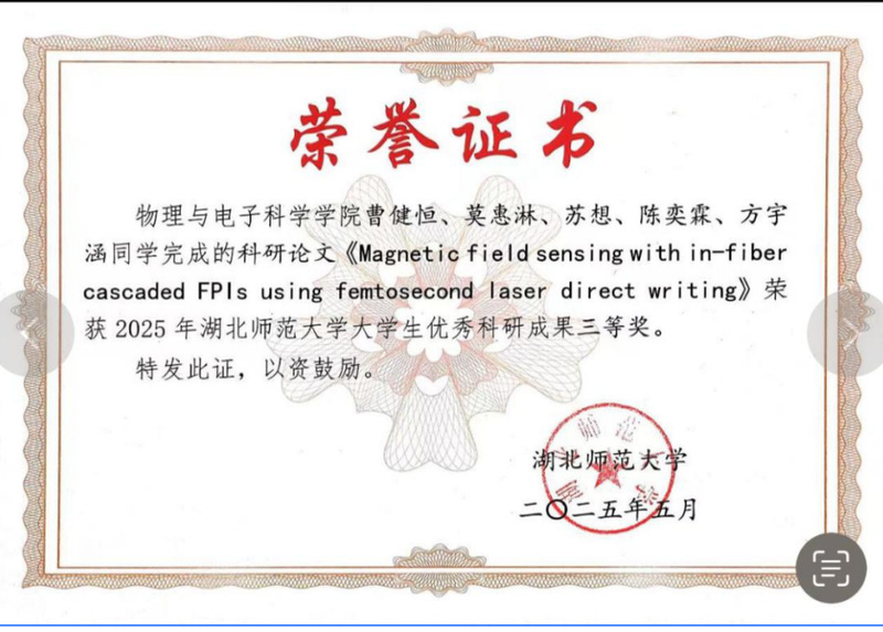 陈奕霖以“科研筑梦、竞赛砺能”为信念,在学术与竞技赛道上双向突破。她聚焦光电传感领域学术研究,参与发表《Enhanced axial strain and vector magnetic field sensitivity in MZI》等 4 篇国家级期刊论文,涉及光纤轴向应变与矢量磁场传感、气液温压传感等前沿方向,为光电技术创新提供理论支撑。科研实践中,深度参与 3 项科研立项:其中,国家级大学生创新创业训练计划项目“基于磁致伸缩材料的高灵敏度光纤传感器的研究”优秀结项,省级项目“便携式‘日记’仪”顺利结项,还参与湖北师范大学校级师范生教育教学研究项目,在跨领域科研协作中锤炼创新思维与团队攻坚能力。