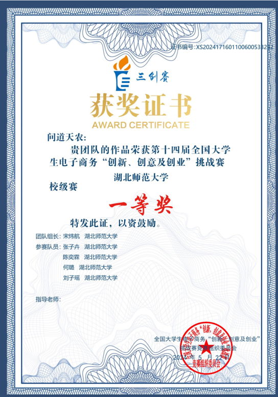 12、2024年5月,第14届全国大学生电子商务“创新,创意及创业”挑战赛 湖北师范大学校级赛一等奖;