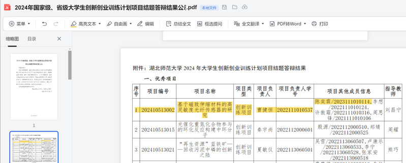 1、2024年6月国家级立项且优秀结项,基于磁致伸缩材料的高灵敏度光纤传感器的研究(202410513002),国家级,大学生创新创业训练计划项目;