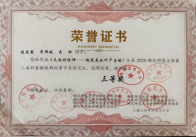 15、2024年6月,2024年湖北师范大学第二届科普微视频比赛,校级三等奖;