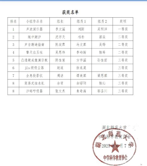 2、2024年10月,第七届全国科学实验展演汇演活动暨2024年湖北省科学实验展演汇演活动,省级二等奖;