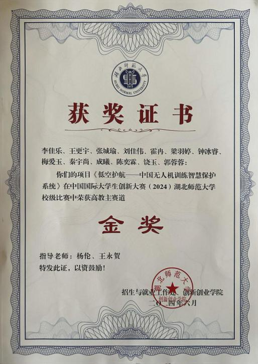 10、2024年6月,湖北师范大学中国国际大学生创新大赛(2024)校级决赛 高教主赛道,校级金奖;