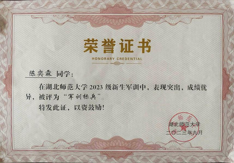 4、2023年9月湖北师范大学2023级新生军训“军训标兵”;