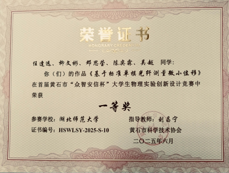 8、第一届黄石市“众智安信杯”大学生物理实验创新设计竞赛,市级一等奖;