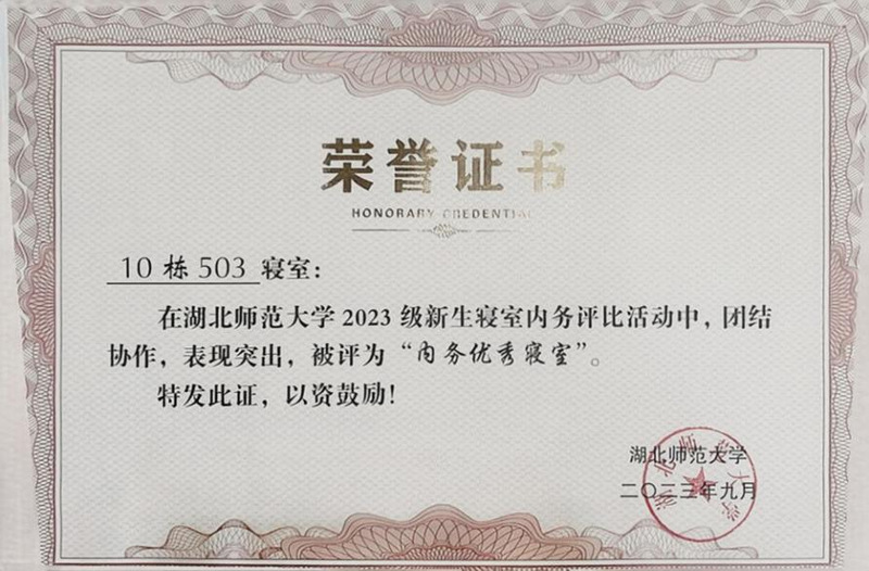 5、2023年9月湖北师范大学2023级新生寝室内务评比获得“校级内务优秀寝室”;