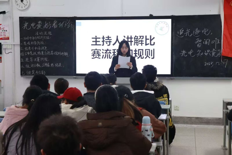 为夯实学生光电领域理论基础,锤炼科学思维与团队协作能力,12月27日,物理与电子科学学院光电爱好者协会于教育大楼1422教室举办了“追光逐电,智闯难关”光电科学知识竞赛。光电爱好者协会会长陈奕霖、全体协会成员与多院参赛选手共同参与本次竞赛。竞赛由秘书部干事刘胜花主持。