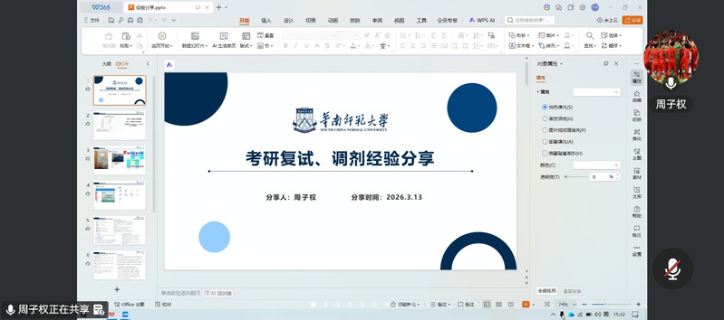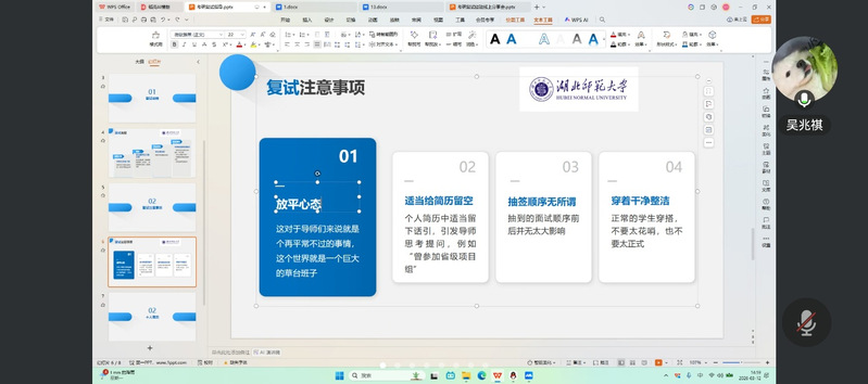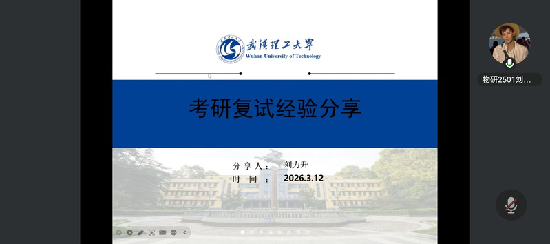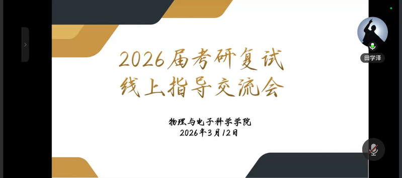 为助力考研学子科学备战复试,掌握应试策略,3月12日,湖北师范大学物理与电子科学学院通过腾讯会议平台举办考研复试经验线上分享会。活动邀请了多位成功考取重点高校的优秀毕业生,围绕复试各环节进行系统讲解与交流,为与会学生提供了切实有效的指导。