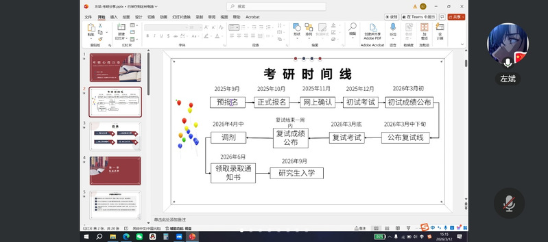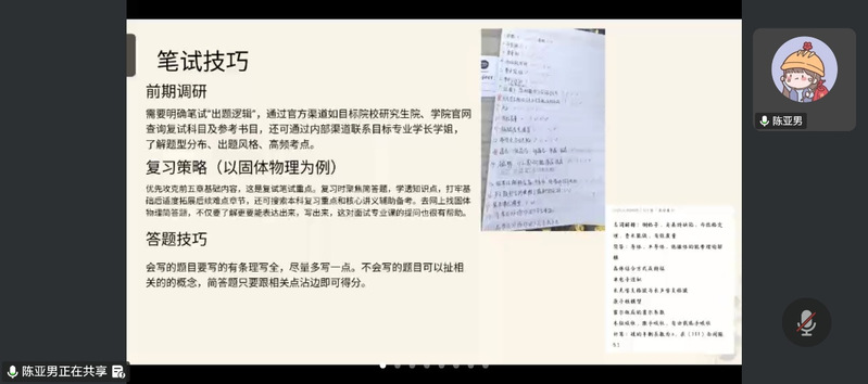 在经验分享环节,来自湖北大学的陈亚男、武汉理工大学的刘力升、湖北工业大学的吴兆祺、华南师范大学的熊旷怡与周子权、南京邮电大学的左斌等优秀毕业生依次发言。他们分别结合自身考研经历,从复试流程、专业课复习、英语口语准备、面试礼仪、心态调节以及调剂策略等方面进行了全面细致地讲解,内容涵盖物理学、电子信息等多个专业方向,具有较强的针对性和实用性。