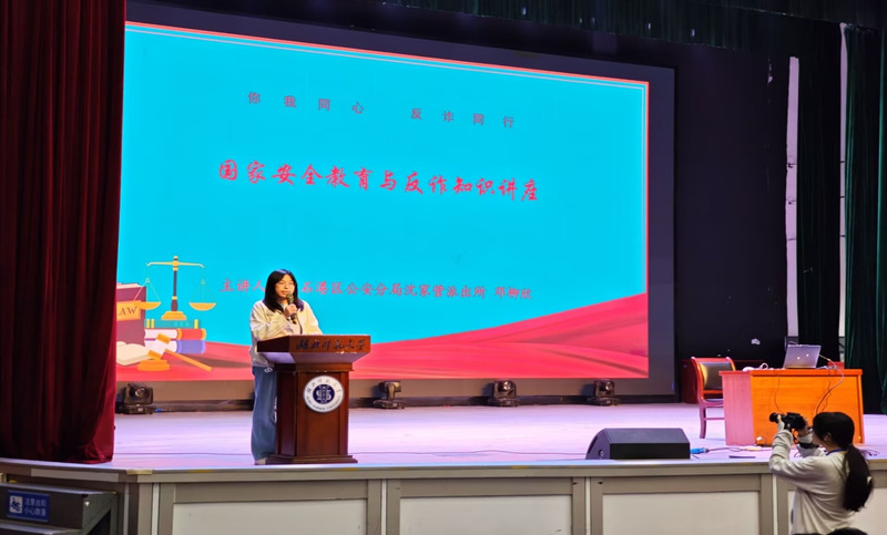 为深入贯彻总体国家安全观,扎实筑牢校园反诈安全防线,切实提升全体师生的国家安全意识与反诈防骗能力,4月9日,湖北师范大学物理与电子科学学院、化学化工学院、生命科学学院联合沈家营派出所,于湖师大礼堂共同开展“你我同心,反诈同行”国家安全教育与反诈知识讲座。本次讲座特邀沈家营派出所民警担任主讲,三院学生及辅导员、沈家营派出所部分警官参会。讲座由邓柳欣主持。